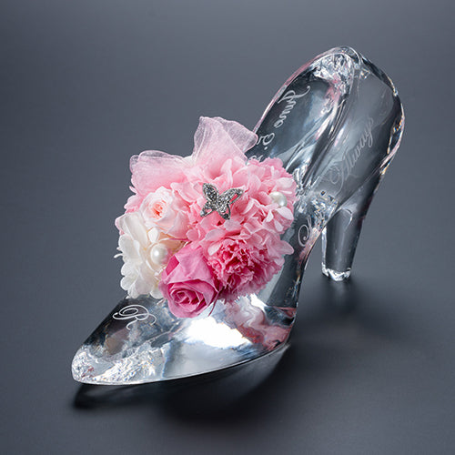 ガラスの靴にプリザーブドフラワーをあしらった可愛らしいデザインが特徴的。