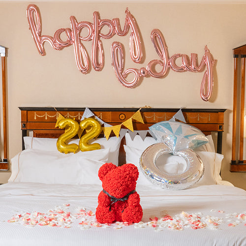 花びらや風船と一緒に彼女が好きなぬいぐるみを置くのも人気な装飾です。