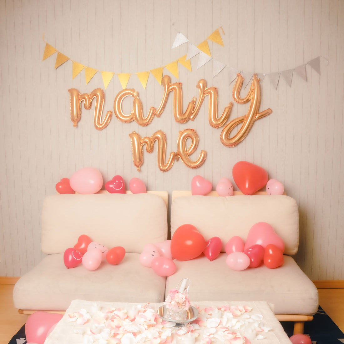 ハート型に並べた花びらの中央に108本のバラの花束や婚約指輪をセットしておけば、ロマンチックな演出ができます。