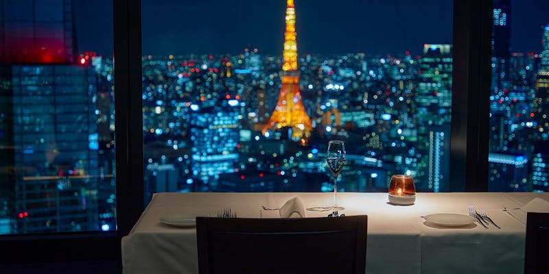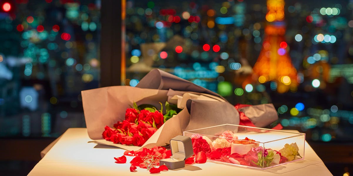東京タワーを一望できる窓際個室はプロポーズにもぴったり。プロポーズプランには「パティシエ特製ボックスケーキ」や「バラの花束12本」も含まれています。
