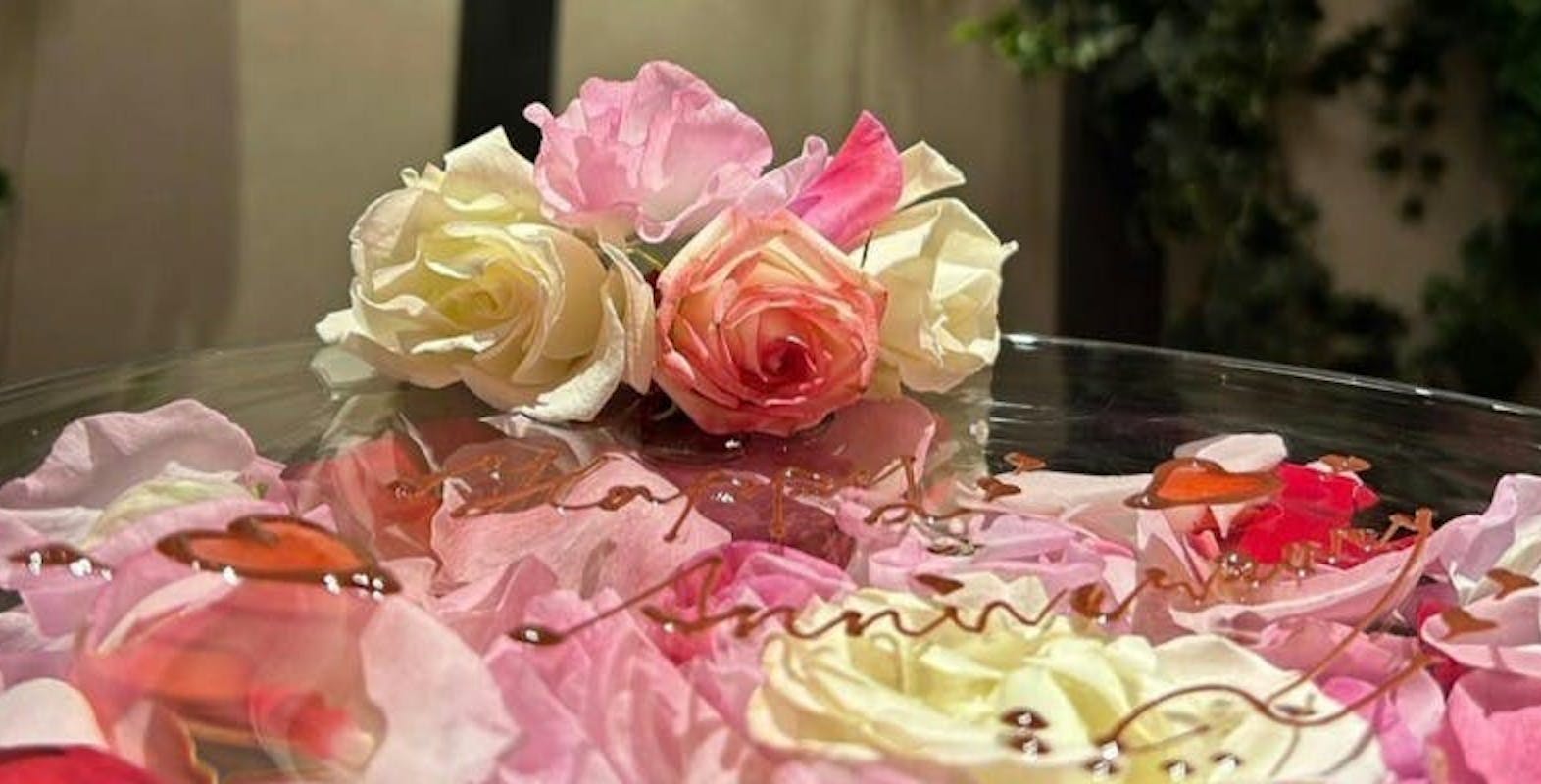 プロポーズプランにはA5和牛や伊勢海老などが含まれるフルコースの他、バラの花束やメッセージプレートも付いています。